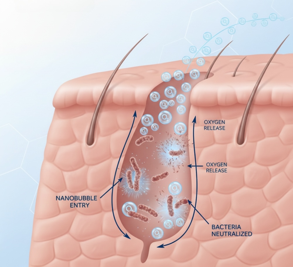 Each nanobubble is smaller than a single pore, allowing beneficial gases to reach the deeper layers of skin where real change happens. The result is visibly clearer, calmer, more hydrated skin without irritation or complexity.
