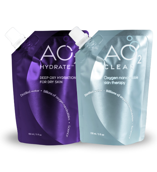 Gas nanobubbles are billions of microscopic bubbles, each smaller than a skin pore, that carry beneficial gases deep into your skin. Unlike traditional formulas packed with chemicals, AO2 SKIN™ uses nanobubbles to deliver targeted results — starting with oxygen for clarity (AO2 CLEAR) and for hydration (AO2 HYDRATE).